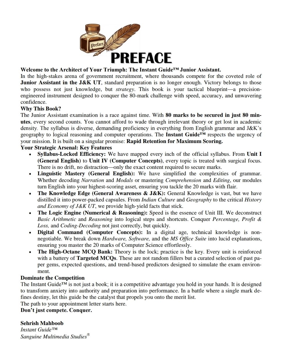 INSTANT GUIDE – JKSSB JUNIOR ASSISTANT (100% Syllabus Coverage) is a complete, exam-focused preparation book specially designed for aspirants of JKSSB Junior Assistant and other JKSSB & JKPSC examinations.